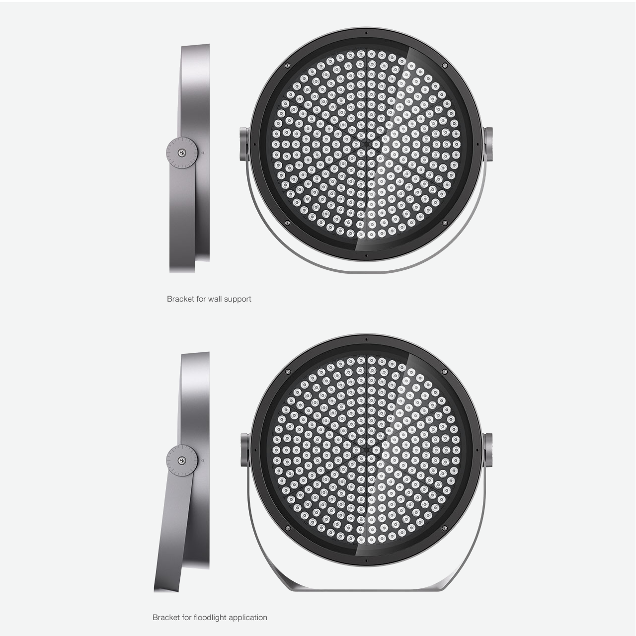 - Comprising an optical compartment in die-cast aluminium and transparent tempered sodium-calcium safety glass. Bracket for application on floodlight and bracket for application on handle to be ordered separately.