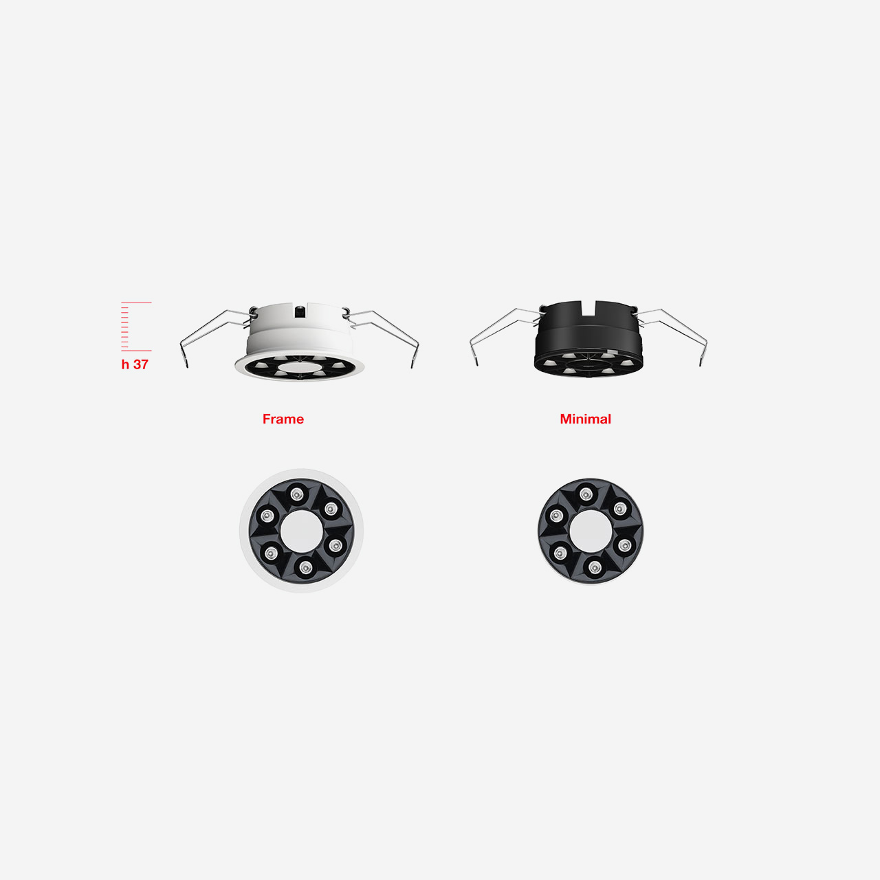 - Flush mount installation on false ceilings of thickness from 12.5 to 25 mm for Minimal versions (without perimeter flap) or 1 to 25 mm for Frame versions (with flap) using torsion springs.
