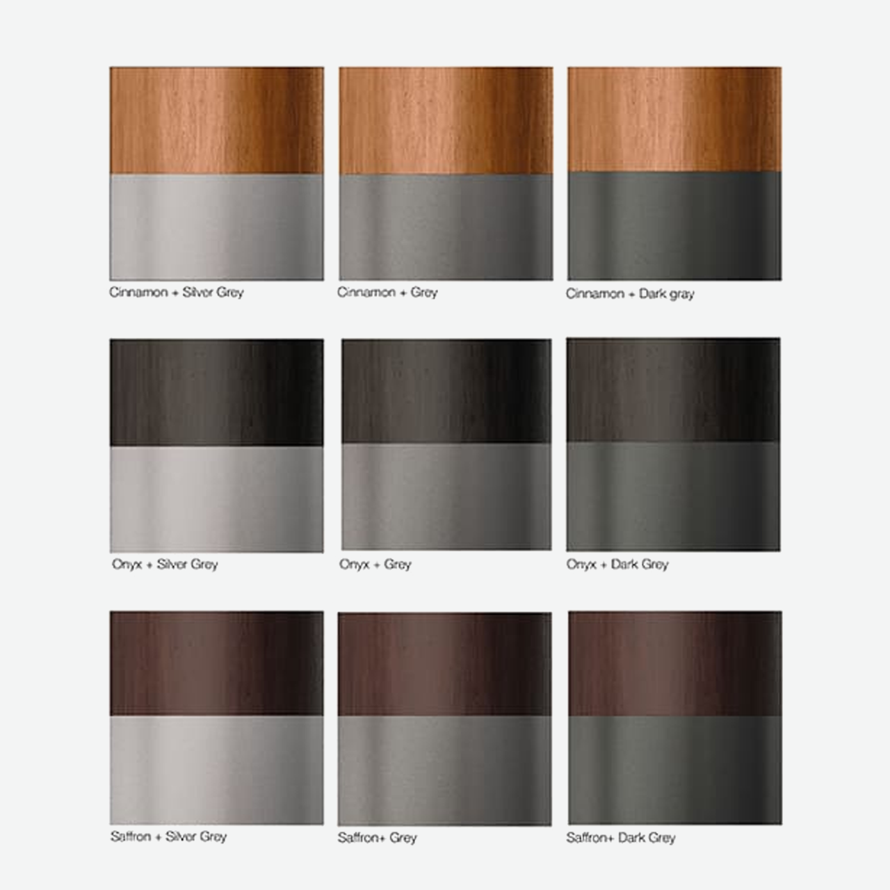 - 9 finishes are available: a combination of 3 wood finishes (cinnamon, saffron and onyx) and 3 steel finishes (graphite grey, silver grey and sand grey).