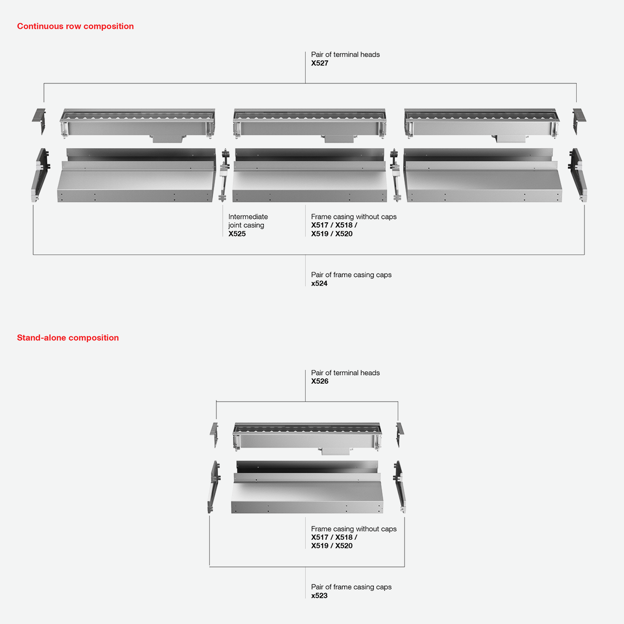 - Extruded aluminium body and flush end caps in die-cast zamak complete with silicone gaskets.