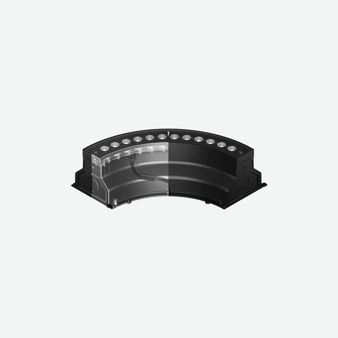 - Body in high performance, black PPS (polyphenylene sulphide) thermoplastic material; tempered sodium-calcium sealing glass with customized black silk-screen printing, 8 mm thick, mounted with silicon on a stainless steel plate with self-securing inserts; the glass + plate unit combines perfectly with the body thanks to stainless steel nuts and a silicone gasket insert.