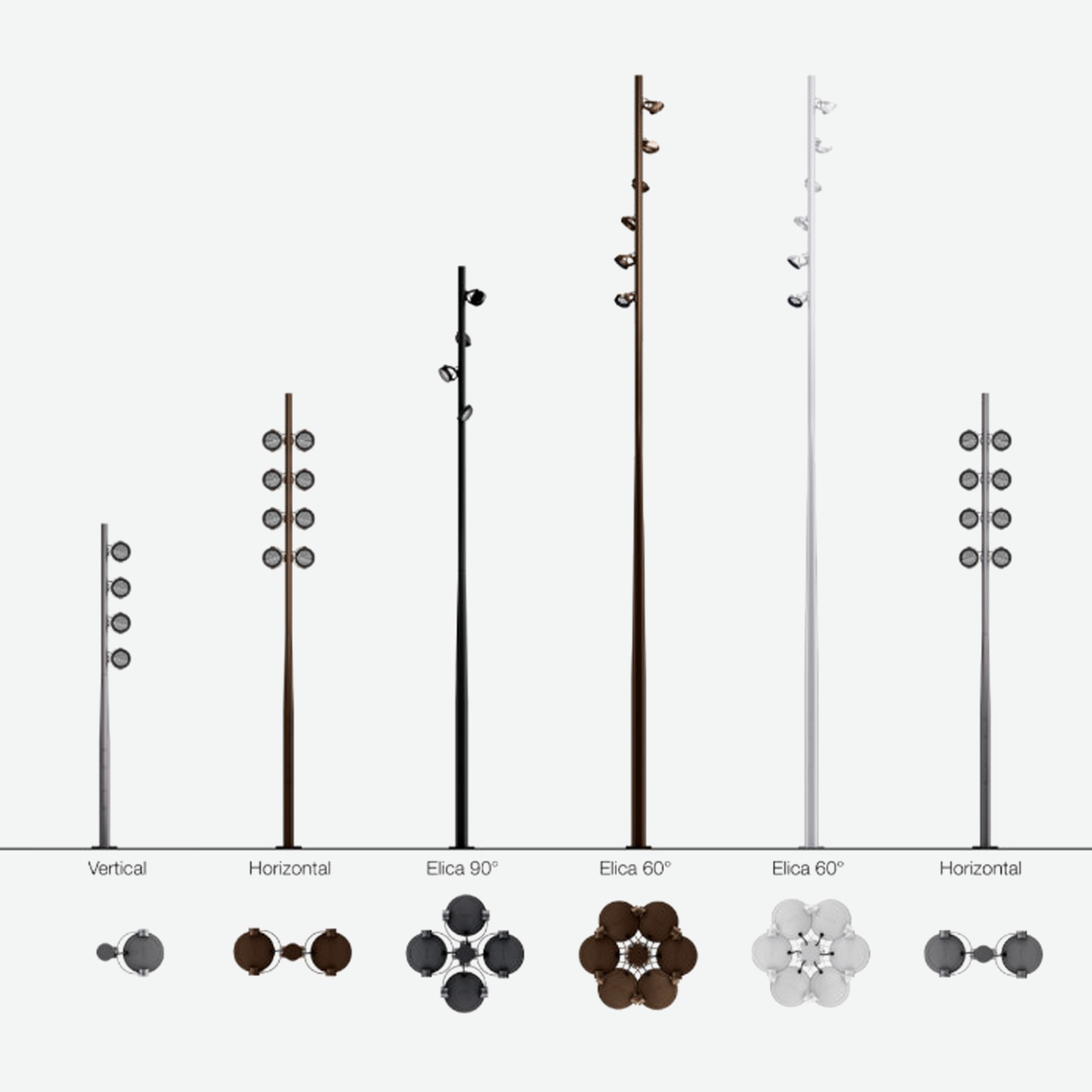 - The cylindrical-conical poles are available in heights of 5, 7, 9 and 12m both in a version for burial and a version with a plate in White, Black, Rust Brown and Grey.